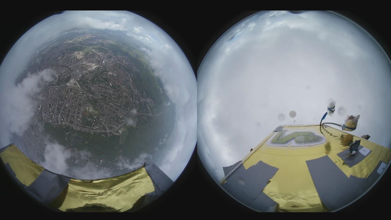 Bekijk in de video hoe de weerballon met de camera de lucht in werd gelaten en prachtige beelden maakte van de aarde. Omdat het om 360-gradencamerabeelden gaat, zijn er twee schermen tegelijk te zien.