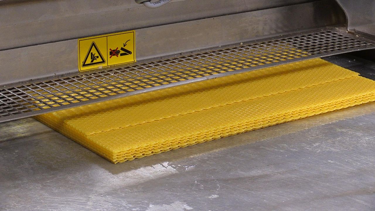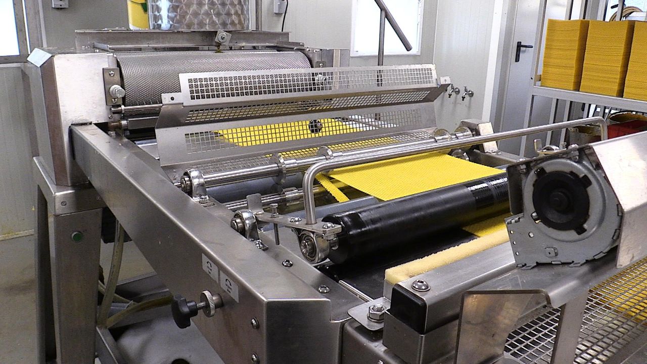 Om de bijen zo gezond mogelijk te houden en ook zoveel mogelijk te proberen om besmettingen en ziektes buiten de deur te houden, zijn Robert en Thea druk met het maken van kunst-bijenraat. In een ruimte naast hun woning staat er enorme 'pastamachine'. Er komen geen velletjes lasagne uit, maar was, keurig gestanst met zeshoekjes, zoals de bijen dat zelf ook doen.