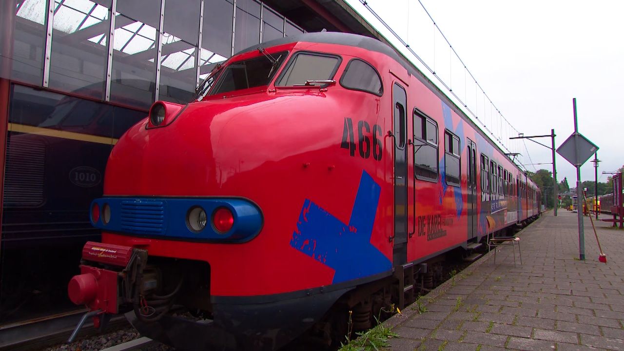De trein uit 1970 vervoerde ooit passagiers in de gele NS-kleuren, maar treinstel 466 valt nu vooral op door zijn knalrode met donkerblauwe kleur. Zo’n vijf jaar geleden kocht Dennis het voertuig van de Nederlandse Spoorwegen, die besloten hadden om deze Mat '64 uit de dienstregeling te halen.