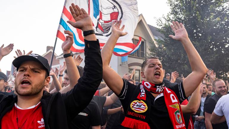 Bij het Philips Stadion wachtten duizenden fans de spelersbus van PSV op. "We verwachten dat we doorgaan en niet zo'n bietje ook. 3-0, bij rust al", aldus een van de PSV-supporters.