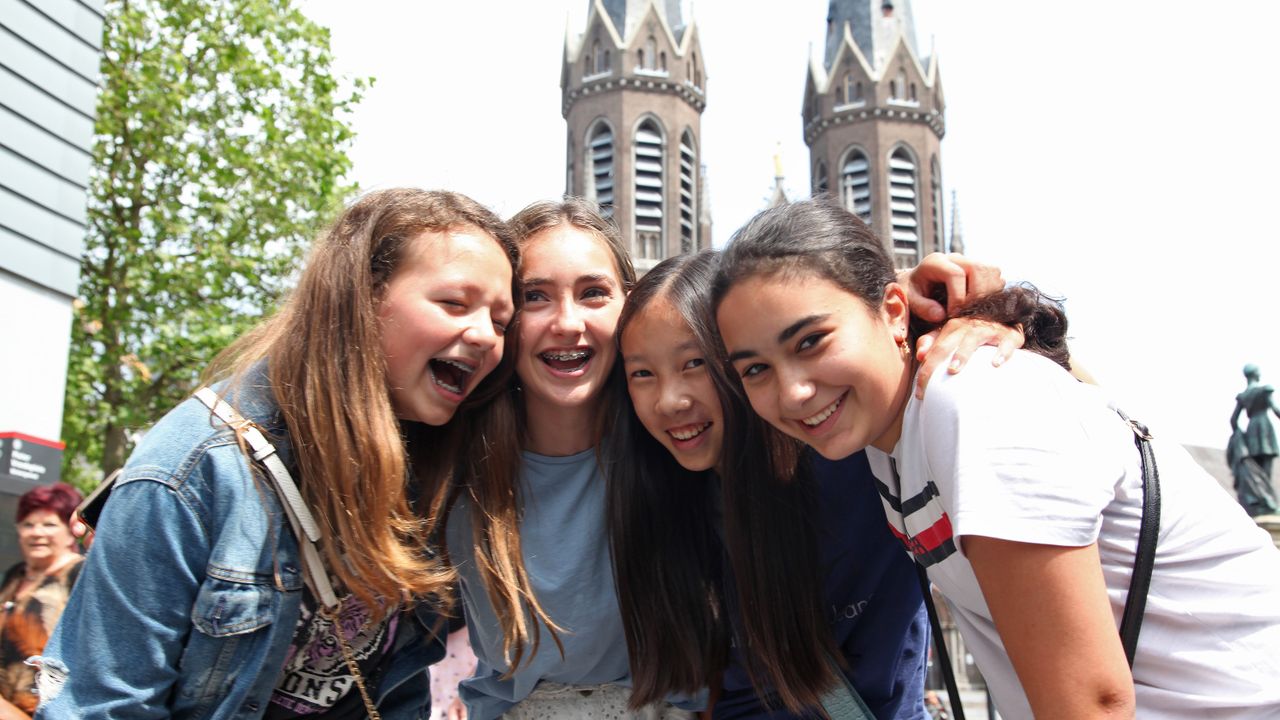Vriendinnen Zoë (12), Isa, (13), Kayleigh (13) en Ceren (14) uit Tilburg houden elkaar stevig vast. "Sinds het begin van het schooljaar zitten we bij elkaar in de klas. Best apart was het om elkaar zo te ontmoeten in coronatijd, want we mochten eigenlijk helemaal niks. De tafels stonden heel ver uit elkaar in de klas, de groep was in tweeën gedeeld met om en om les. Toch zijn we goede vriendinnen geworden.