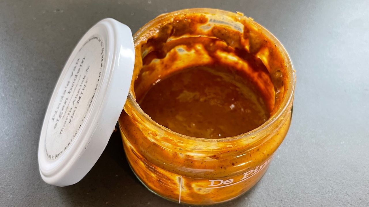 Slechts één potje is er nog over en daar mogen wij nu uit proeven. Een stokje gaat in de pot en na een flinke draai, komt Anniek met een klodder pindakaas aanzetten. Het proeven kan beginnen. En onze verslaggever is enthousiast: “Het doet mij denken aan de 100 procent pindakaas, maar dan ietsje dikker. Het zit tussen de gewone en de 100 procent pindakaas in. Heerlijk."