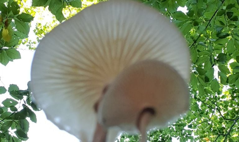 Op de foto van René van Kuik kijk je naar de onderkant van een hele witte paddenstoel. Door de tegenlicht opname kan je ook mooi de lamellen of plaatjes zien van deze paddenstoel en we hebben hier dan ook te maken met een porseleinzwam. Deze bijzonder mooie paddenstoel tast meestal in gezonde bomen, alleen delen aan die al verzwakt zijn. Je komt porseleinzwammen het meest tegen vanaf augustus tot november. Ze groeien dan vooral op takken en stammen van beuken en minder vaak tot zeldzaam op eiken. Porseleinzwam zijn eetbaar maar dan enkel de hoeden. Toch wordt deze paddenstoel zelden gegeten omdat de smaak tegenvalt.