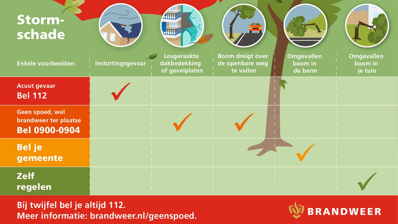Wie bel je als je stormschade hebt? Dat zie je in dit plaatje van de brandweer: