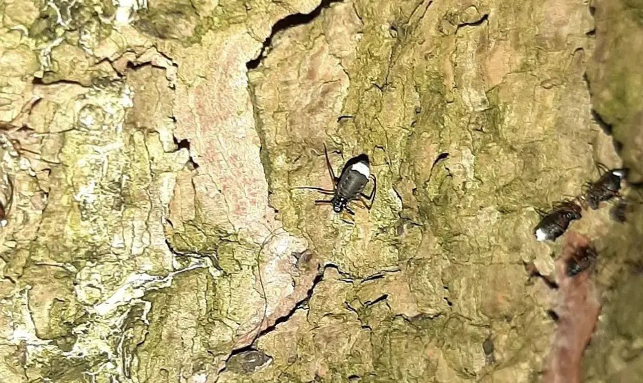 Martina Langenhuysen stuurde mij een foto van een stam van een grove den met daarop heel veel diertjes. Zij dacht dat het kevers zijn, maar dat zijn het niet. Het zijn speciale hooiwagens, spinachtigen dus. Zo te zien zijn het Nemastoma dentigerum, geen Nederlandse naam, en dat zijn kleine, zwarte hooiwagens met korte poten in tegenstelling tot de gewone hooiwagens, die hele lange poten hebben. Deze kleine zwarte hooiwagens leven voornamelijk onder stenen en hout en dus ook onder schors. Vermoedelijk zijn ze vanaf begin 2000 in ons land. Grappig is als ze verstoord worden, want dan trekken ze de pootjes in en rollen ze meteen weg.