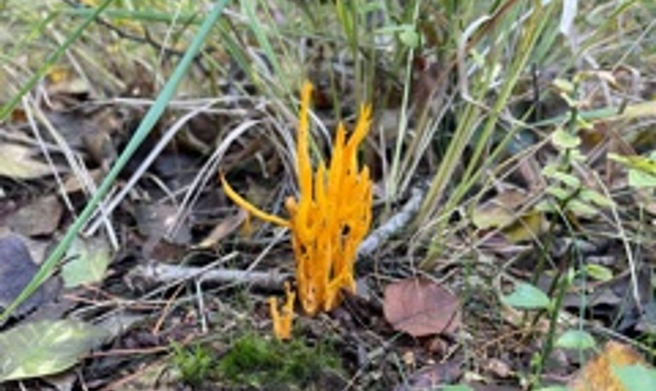 Monique van de Ven-Hoefs kwam op haar wandeling een klein gele paddenstoel tegen. Die kleine gele paddenstoel heet het kleverig koraalzwammetje en op dit moment kan je heel veel van deze zwammen vinden in de bossen. Deze kleine zwammen leven als saprofyten; van dode materialen op vermolmde stronken en stammen van naaldbomen. Je ziet ze niet zo vaak, omdat de vruchtlichamen - dat wat boven de ondergrond uitsteekt - soms heel klein zijn. De grootte varieert van twee tot acht centimeter. In de herfst laten deze kleverig koraalzwammetjes zich pas zien. Dan komen ze in allerlei vormen voor. Je kunt zwammetjes aantreffen met rechte vertakkingen, maar je ook vormen met heel veel vertakkingen. Voel ze maar eens voorzichtig, dan snap je waarom dit zwammetje kleverig koraalzwammetje heet.