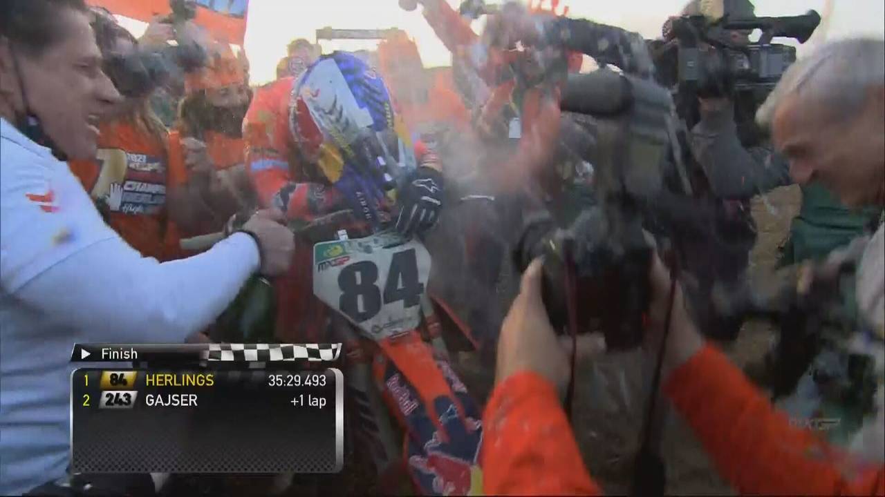 Herlings won eerder deze middag de eerste manche en daarmee kwam hij op gelijke hoogte met Febvre. Bekijk hier hoe Herlings in een mum van tijd zowel Febvre als teamgenoot Jorge Prado passeerde en zo de koppositie greep. Die stond hij, ondanks last in de onderarmen, niet meer af.