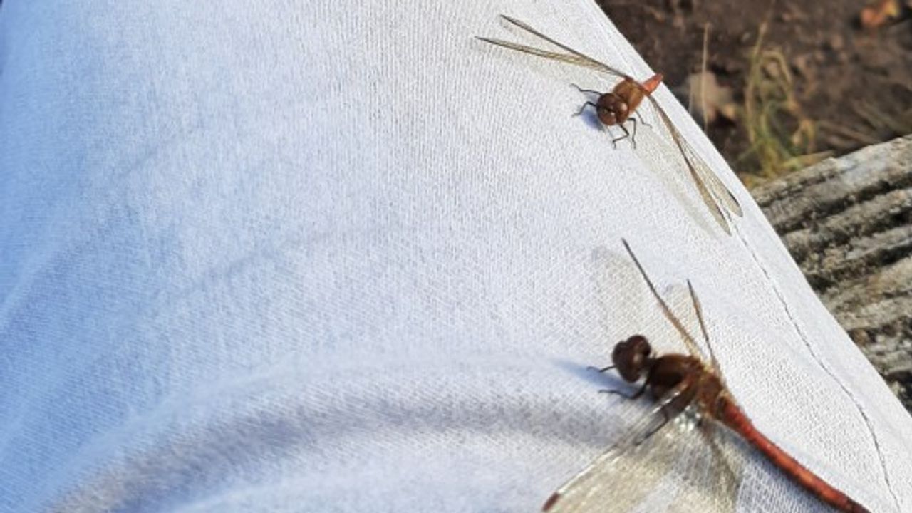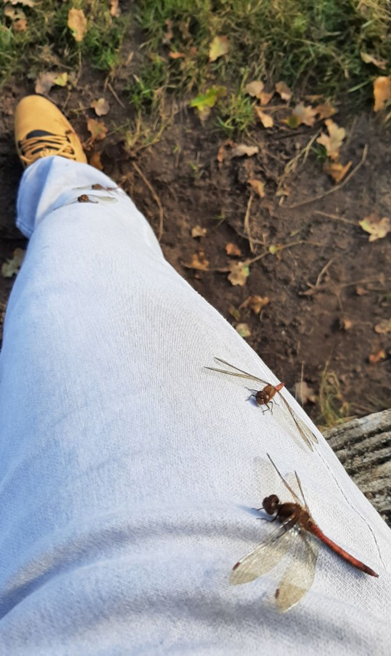 Jeroen Verzijl was aan het wandelen in mijn favoriete natuurgebied en toen hij even wilde uitrusten en dus stilstond. Vier libellen waren ook toe om even uit te rusten en landen alle vier op de lichte spijkerbroek van Jeroen. Volgens mij zijn het alle vier rode heidelibellen. Ik vermoed de bruinrode heidelibel, maar ik weet het niet zeker. Die lichte kleur van zijn broek is de reden dat ze daar op geland zijn, wat dat geeft extra energie voor deze koudbloedige dieren in de wat koudere omgeving. Daarnaast beschouwden ze Jeroen zijn been als een soort paal. Dus hij stond letterlijk voor paal.