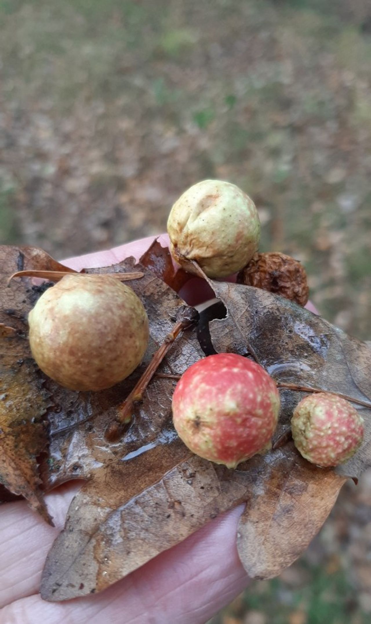 Leda Rovers vond een eikenblad op de grond met daarop kleine balletjes en stuurde mij de foto met de vraag wat zijn dat? Op dat eikenblad zitten hele mooie galappels met twee nog verse en de anderen al in een verder stadium. Deze galappels ontstaan door een samenwerking tussen galwespen en eikenbomen. Vrouwtjes galwespen spuiten in de nervatuur van het blad een groeibevorderende, chemische stof en dan ontstaat er op die plek soort specifieke bij die soort horende woekering, die we galappel noemen. Midden in de galappel is een rond kamertje waarin de ontwikkeling tot volwassen galwesp plaatsvindt. Dus eerst een eitje, daarna de larve, vervolgens een pop en uiteindelijk kruipt een volwassen galwesp uit de galappel. De ongeveer 2 cm grote kogelronde galappels zijn eerst mooi groen van kleur. Daarna worden gedeeltelijk rood, zie foto, en daarna bruin.