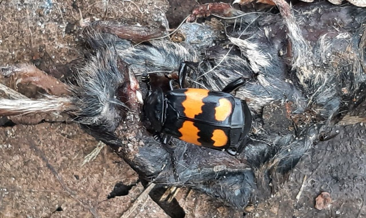 Rianne van Beers stuurde mij een foto van een kever op een dode muis en zij vroeg zich af of dit een doodgraver is. Op die foto zie je heel duidelijk een van de doodgravers, namelijk de gewone doodgraver. De gewone doodgraver behoort tot de familie van aaskevers. Andere soorten in die familie zijn; de krompootdoodgravers en zwarte doodgravers. De drie genoemde zijn de meest bekende van de 8 doodgravers die in ons land voorkomen. Wanneer er ergens een lijk ligt (bijvoorbeeld dode muis) dan heeft dat een enorme aantrekkingskracht op de gewone doodgravers. Vaak komen er dan meerdere doodgravers, mannelijke en vrouwelijke, op af. Het gevecht wat daarna volgt heeft als resultaat dat er een koppeltje overblijft. Samenwerkend begraven ze het lijk, verwijderen haren of veren en smeren het in met een speciale vloeistof die de ontbinding van het lijk vertraagt. Daarna legt het vrouwtje de eitjes, in een speciaal uitgebeten kamertje, en blijft wachten tot dat de larven een paar dagen later uitkomen. Na het voeden van de larven zit haar taak er pas op.