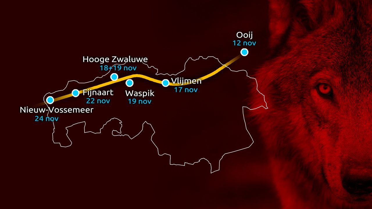 In de nacht van 10 op 11 november werden enkele schapen doodgebeten in de Ooijpolder in Nijmegen, vlakbij de Duitse grens. Op beelden van een nachtcamera is te zien dat het om een wolf gaat, stelden deskundigen vast. Later liep de wolf midden op straat in Lage Zwaluwe en sloeg hij onder andere toe in Vlijmen en Hooge Zwaluwe.