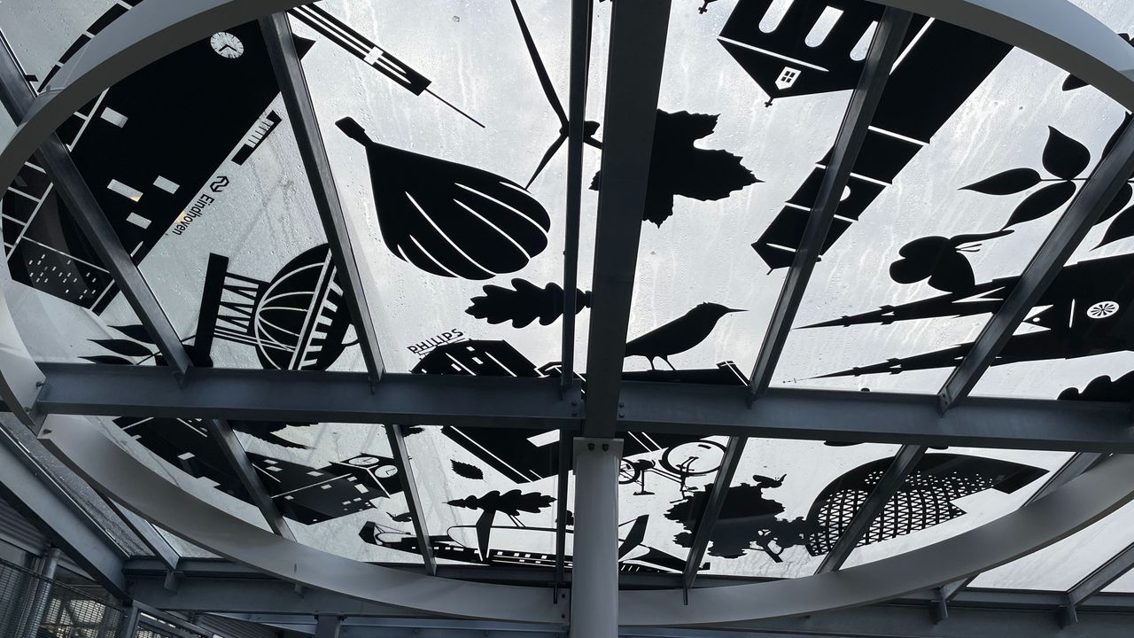 In de overkapping zijn afbeeldingen verwerkt die met de regio te maken hebben. Tijdens het wachten hebben de reizigers zo ook nog wat te zien. Het is volgens De Roy een kennismaking met de Brainportregio. “Je ziet hoogtepunten en iconen zoals van Gogh en PSV. Ook zie je de gloeilamp, de Lightyear, het cassettebandje en het Evoluon. Je weet dat je in Eindhoven bent als je hier landt.”