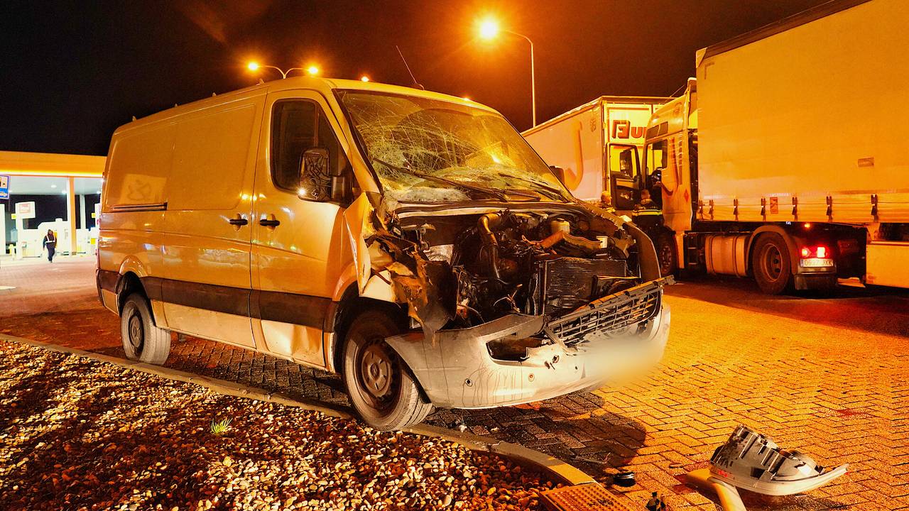 Busje botst op vrachtwagen op parkeerplaats bij tankstation