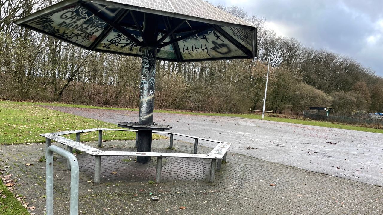 De hangplek is donderdagmiddag rustig. Maar op de grond liggen restanten van afgestoken vuurwerk. Op een bankje zijn sporen van een vuurtje te zien. "Ze beginnen vaak in de avond", vertelt de vrouw. "Laatst kwam er zo'n harde knal, dat het wel een bom leek. Ik zag later dat ze de prullenbak hadden opgeblazen en dat die zo'n 20 meter verderop lag."