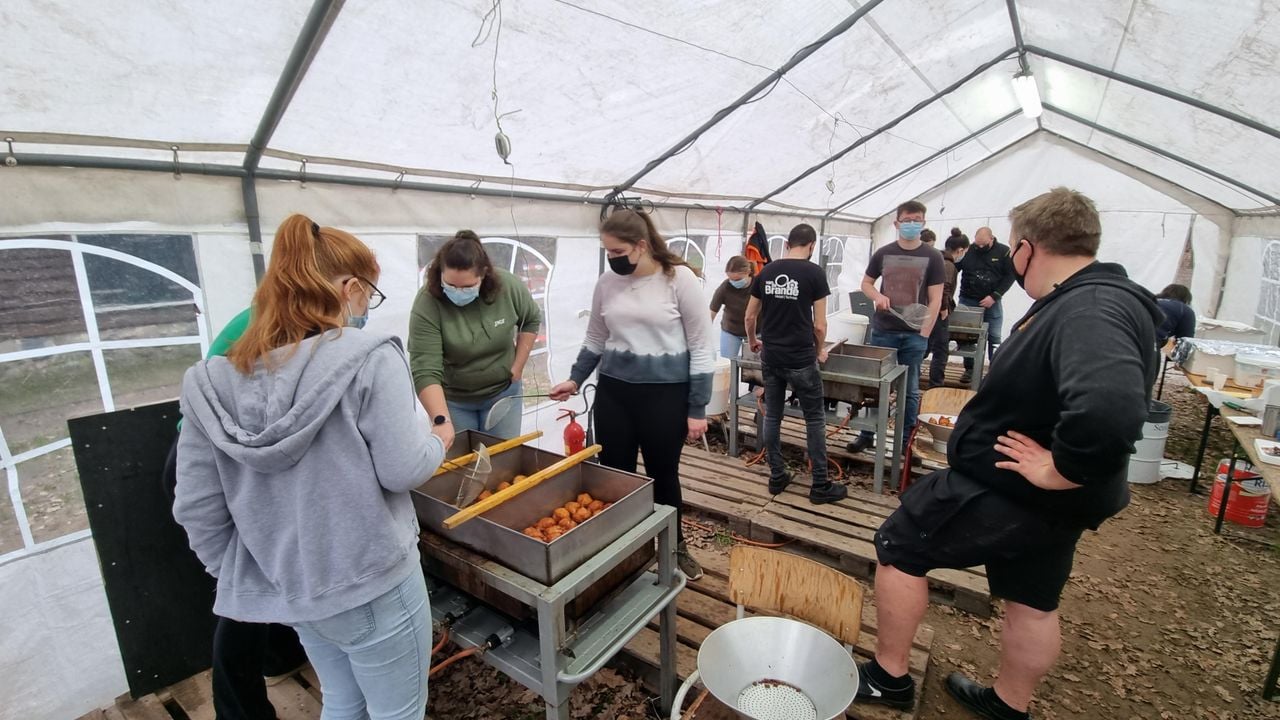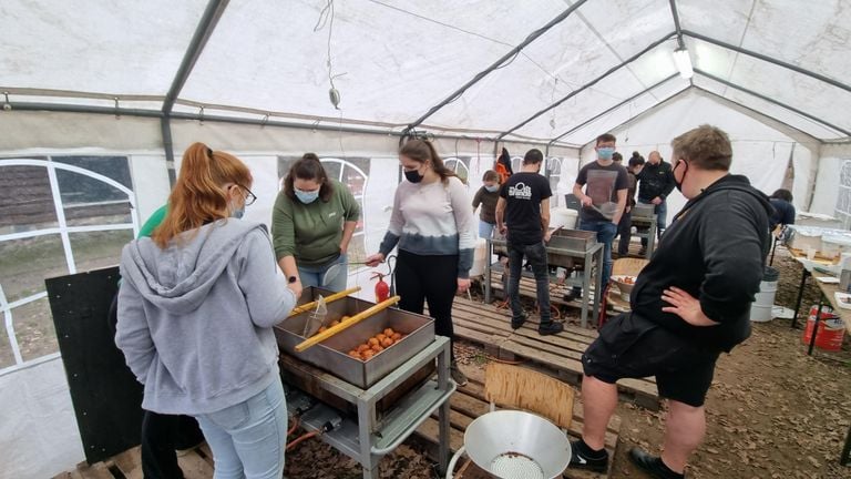 In de tent achter de loketten wordt druk doorgebakken door de scouts. Die staan letterlijk de hele dag in de oliebollenlucht. Je zou zeggen dat ze geen oliebol meer kunnen zien of ruiken, maar dat valt mee. "Er gaat zo nu en dan nog zeker een bolletje in hoor", zegt Wouter lachend.