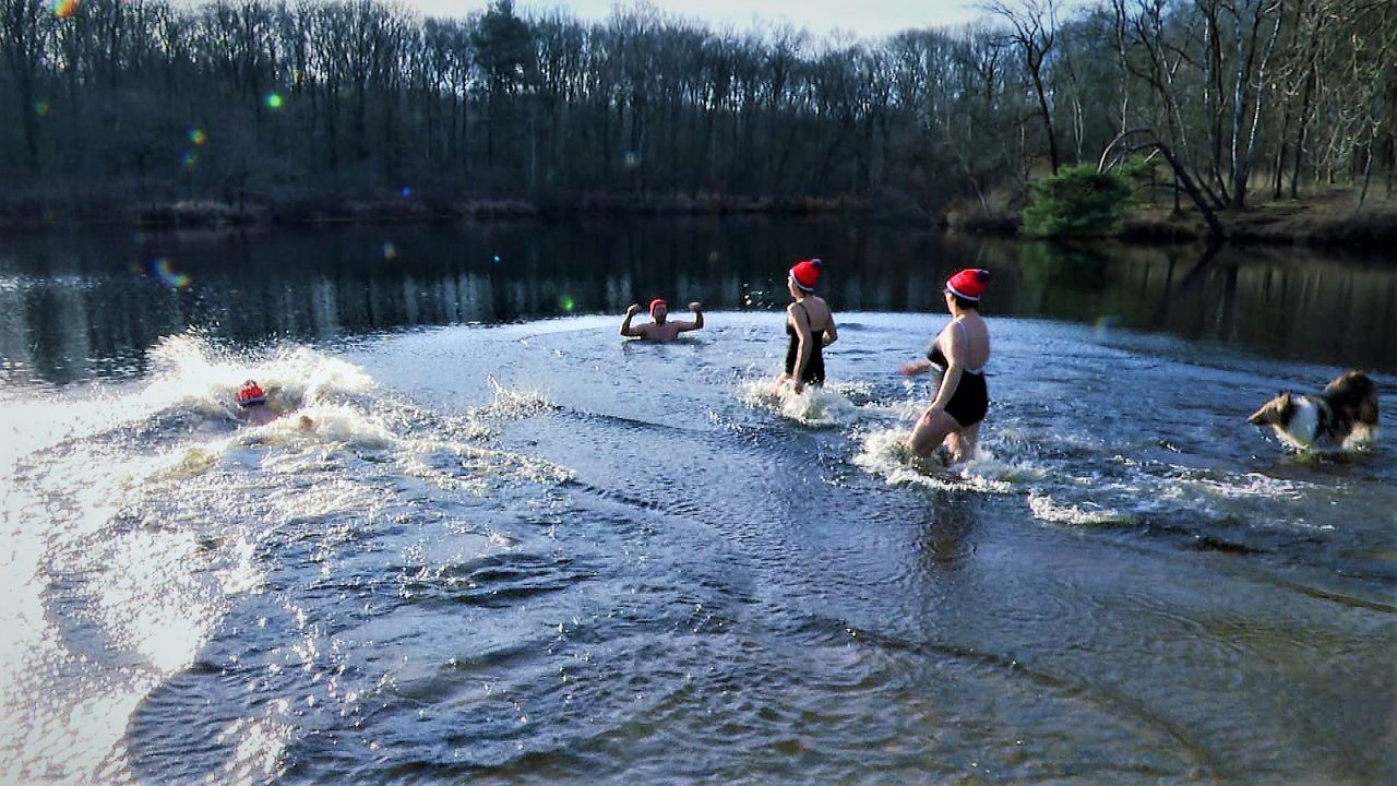 Met wat ijzige gillen gooien ze het zilte water eerst over zichzelf en daarna over elkaar heen. Maar daar blijft het niet bij. Het kleine gezelschap schiet met een sprintje het koude water in Waalwijk in. "Gaan met die banaan! Go with the flow", schreeuwt Van der Velden, voordat hij in het water plonst.
