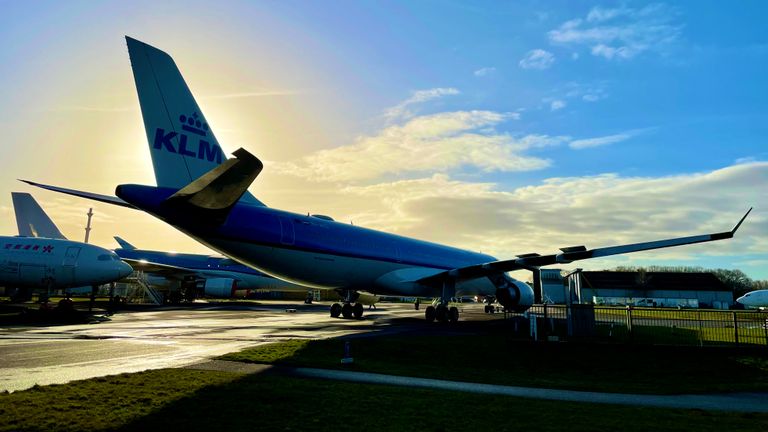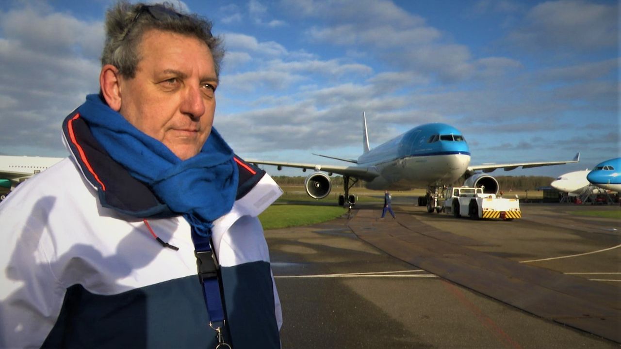 Op de achtergrond landt een Airbus 330 van de KLM. Het landingsgestel moet worden aangepast en dat mag alleen worden gedaan door hooggekwalificeerd en gecertificeerd personeel, zoals bij Fokker Techniek op Woensdrecht. Op het 'parkeerterrein' voor vliegtuigen voor de hangar moet wat worden geschoven, want er is bijna geen plaats meer.