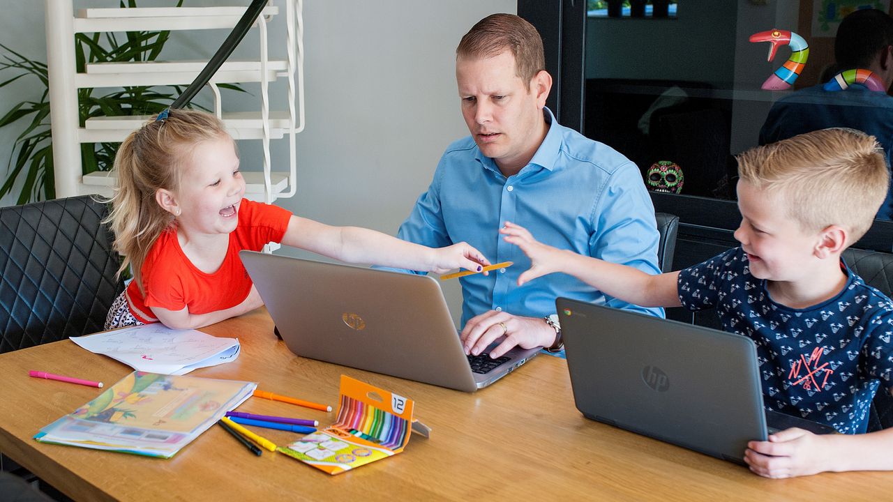 Teuntje: “Dit vind ik de allerleukste thuiswerk-foto. De kinderen met kleurpotloden.” Astrid: “Je ziet de vader geërgerd kijken, zo van: ‘Verdorie!’.”