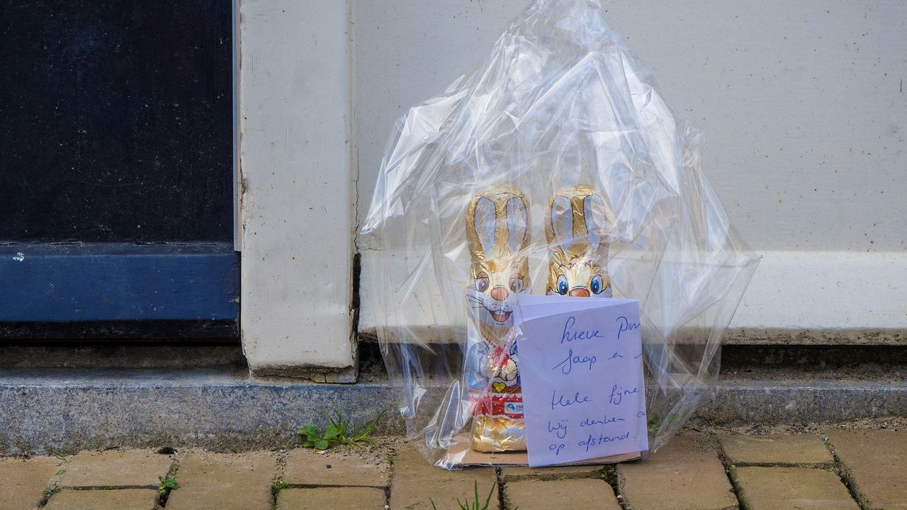 Teuntje: “Dit kwam Maria toevallig tegen op straat. Een chocolade paashaas bij de voordeur, met een lief briefje erbij. Dit kun je niet verzinnen, daar moet je oog voor hebben.”