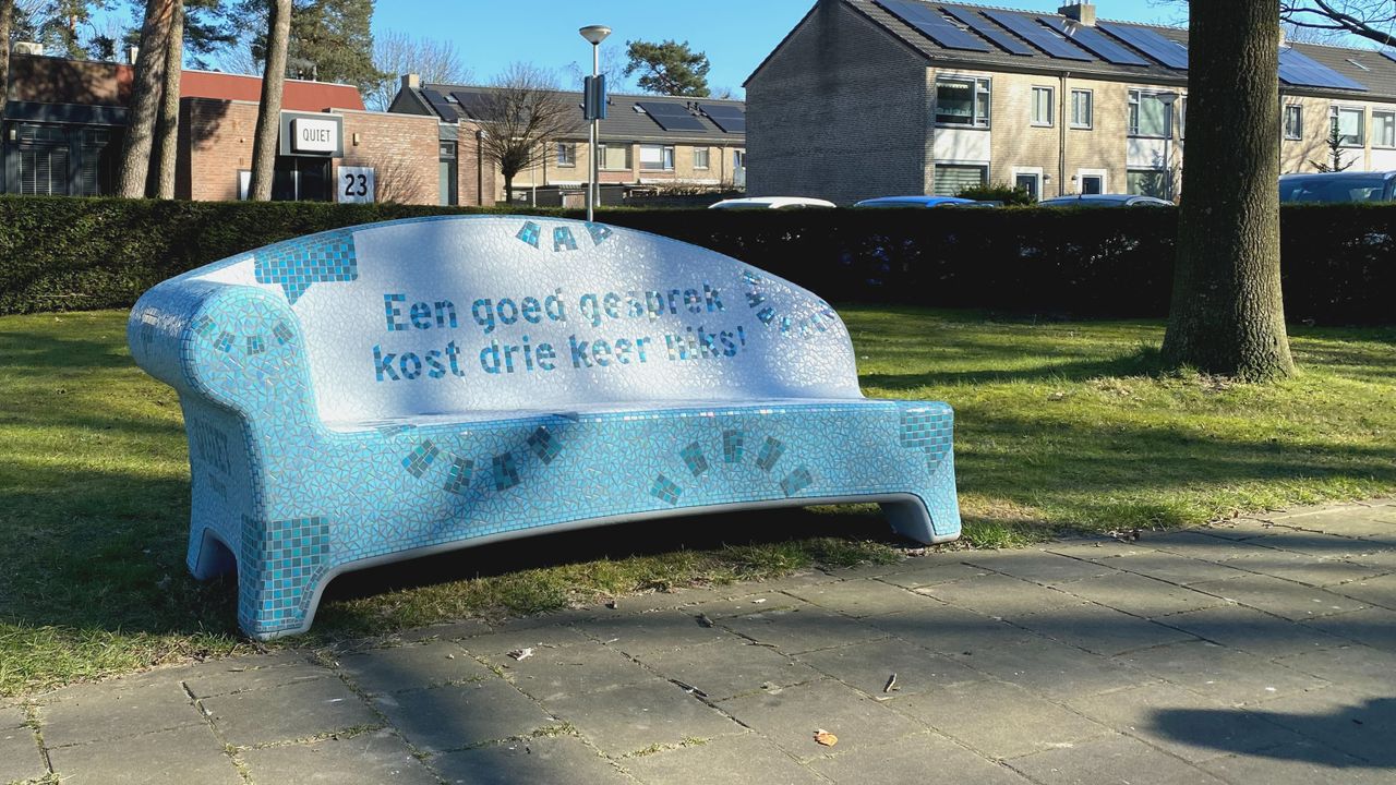 Op het bankje dat gemaakt is van honderden stukjes mozaïek, staat: ‘Een goed gesprek kost drie keer niks’ en op de achterkant de hashtag: #ikzitmetarmoede.