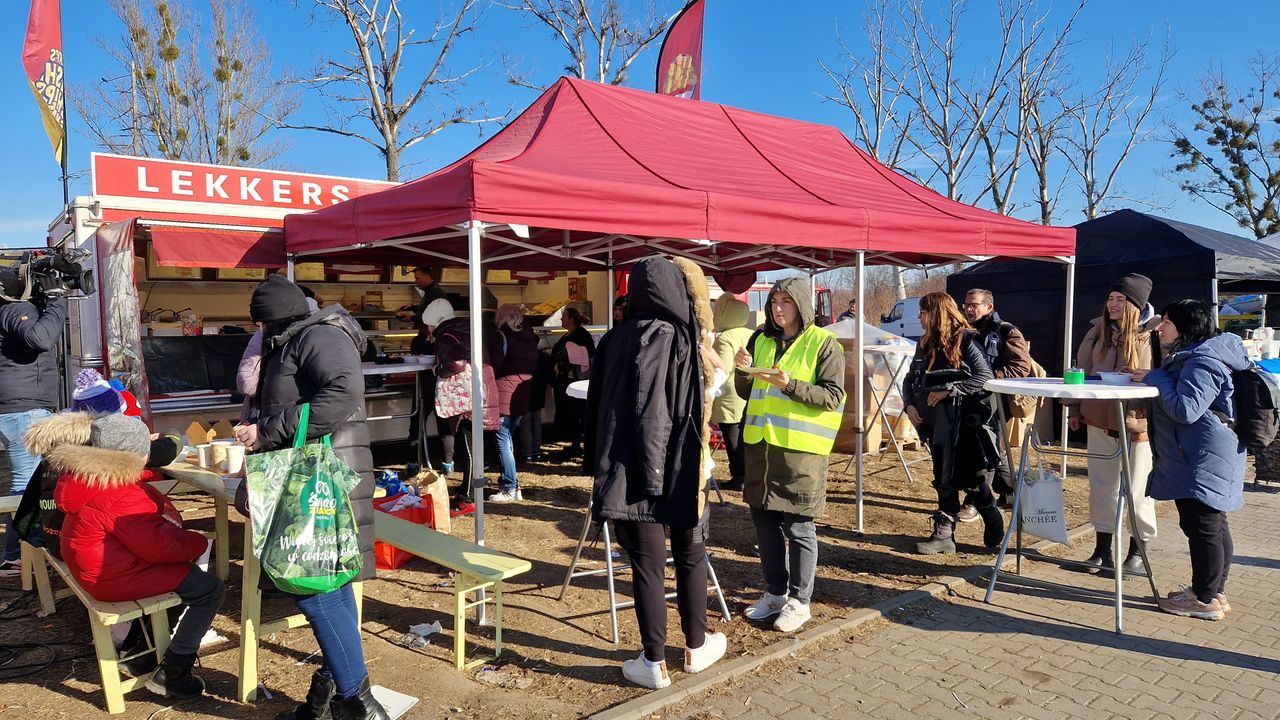 Aan de grens van Polen en Oekraïne stuitte het duo op een chaos: "Vrachtwagens met goederen en bussen met vluchtende mensen. We hebben onze frietkar aangesloten en zijn begonnen met bakken", vertelt Coen.