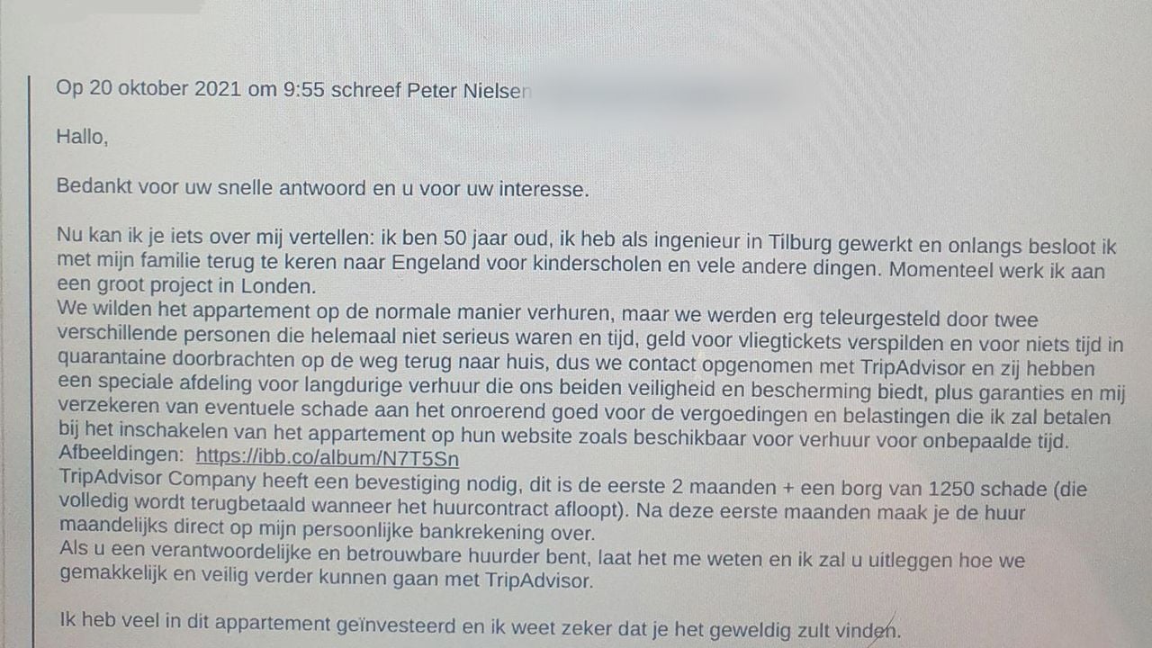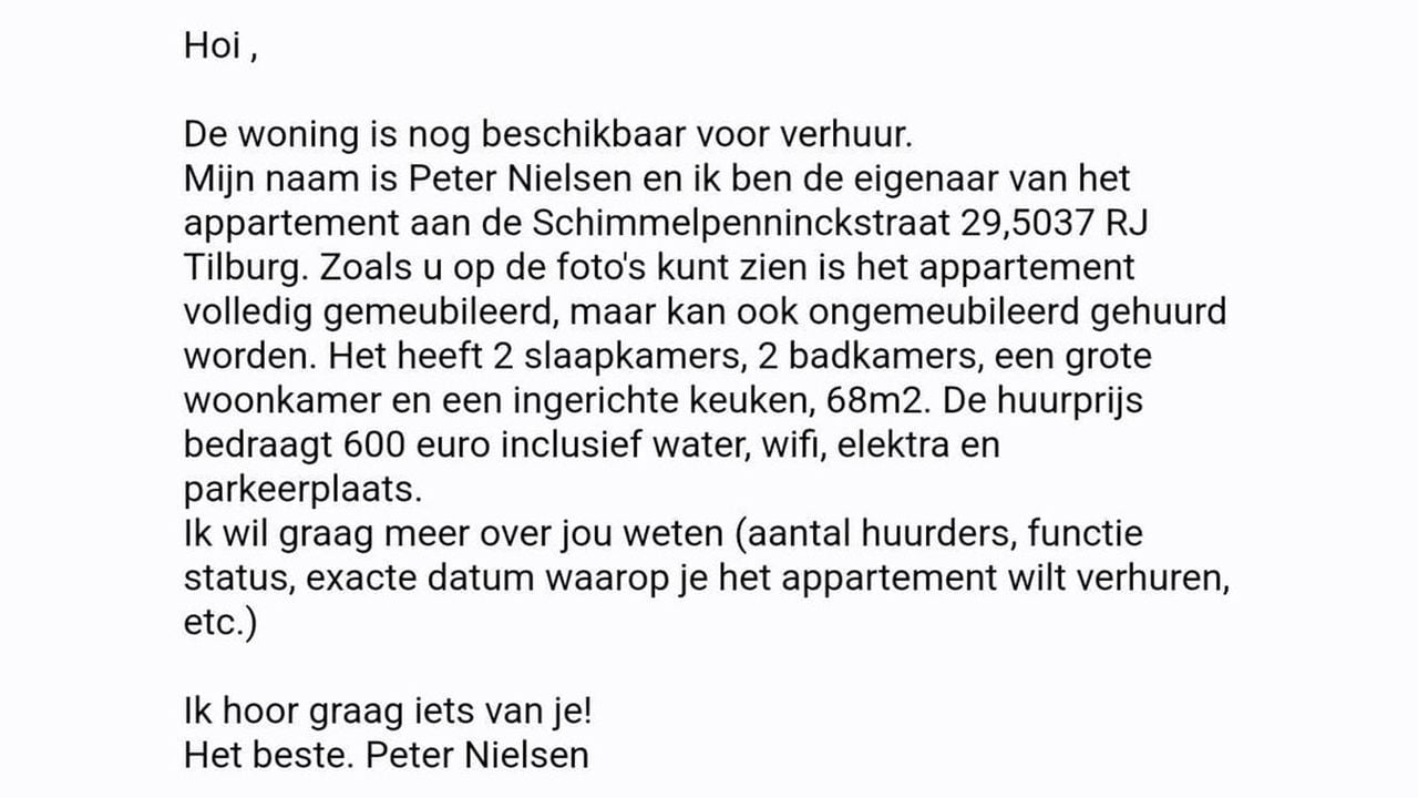 Maar het bleek geen misverstand. Er stond een advertentie op Facebook voor het huis dat Magdalena en Saïd al huren. Een advertentie die moet zijn geplaatst door een oplichter. Aan die advertentie klopt sowieso een boel niet, vertelt Magdalena. “In de advertentie staan foto’s van een appartement. Het stond aangeboden als ‘appartement in Tilburg voor 600 euro'. Maar als je ons adres googelt zie je toch meteen dat het om een rijtjeshuis gaat”, zegt ze geïrriteerd.
