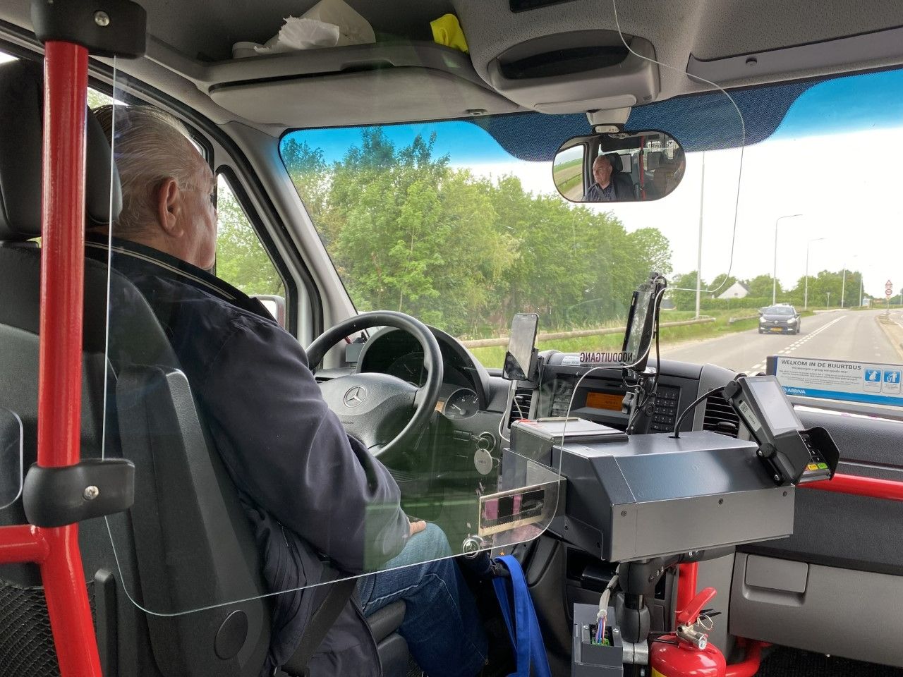 Hij is al een paar uur aan het werk als wij hem spreken. Vanaf zeven uur 's ochtends is hij bezig. De rit die Piet nu rijdt is die van 09.05 uur en eindigt om 10.10 uur weer bij deze halte, als de hele route gereden is. “Ik heb vanochtend slechts vier passagiers gehad. Twee scholieren en twee werkende mensen.”
