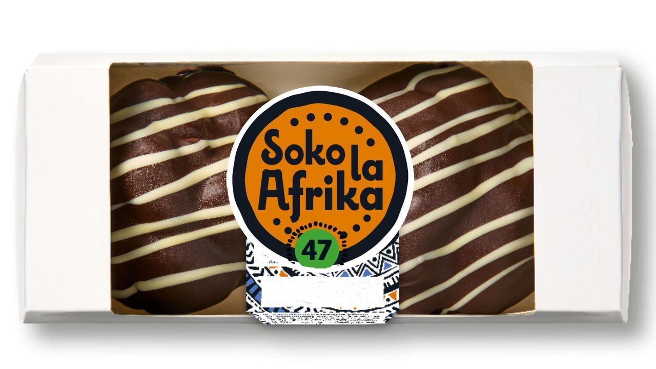 Ze staan er echt. Midden tussen de Zuid-Afrikaanse producten als Melktaartjes en bakmix voor Malvapudding. Twee voor 2,89 euro. 'Chocoladebol met zebrastrepen gevuld met slagroom', staat er bij de foto.