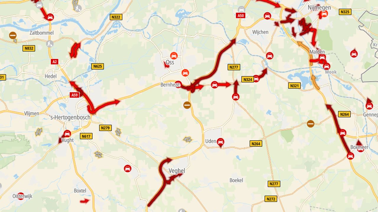 Op de snelweg A50 van Eindhoven richting Nijmegen waren verschillende files te zien. Het was zowel op snelwegen als N-wegen kilometers aanschuiven bij stilstaand of langzaam rijdend verkeer. Ook de A73 tussen Boxmeer en Nijmegen kleurde het donkerrood van de auto's.
