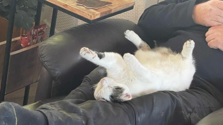 "Wij moesten die ochtend heel vroeg weg en toen lag hij voor de deur. Toen we de deur opendeden, schrokken we hoe mank hij liep. We zagen dat zijn linker voorpootje echt bleef hangen. Dat is niet goed, dachten we. Maar toen sprong hij op de bank en viel hij eigenlijk meteen in slaap. Toen hebben we hem even laten slapen en besloten we daarna te bekijken of hij het pootje weer wilde gaan gebruiken."