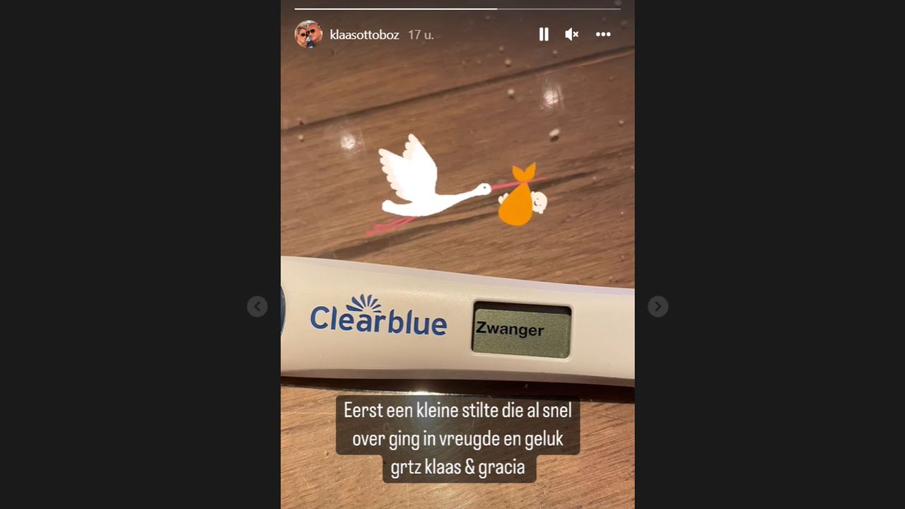 "Eerst een kleine stilte die al snel over ging in vreugde en geluk”, meldt het stel bij een foto van de positieve zwangerschapstest. Klaas Otto heeft al een dochter en twee zoons. Gracia heeft ook een kind uit een eerdere relatie.