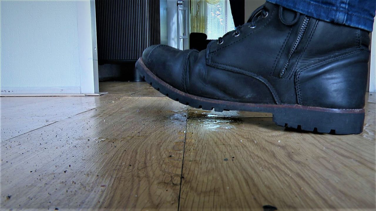 In de berging ligt de volgezogen betonnen vloer los rond de deurposten. In de woonkamer zijn de gordijnrails met schroeven en pluggen en al uit het plafond gevallen. Alles is doordrenkt met vocht.