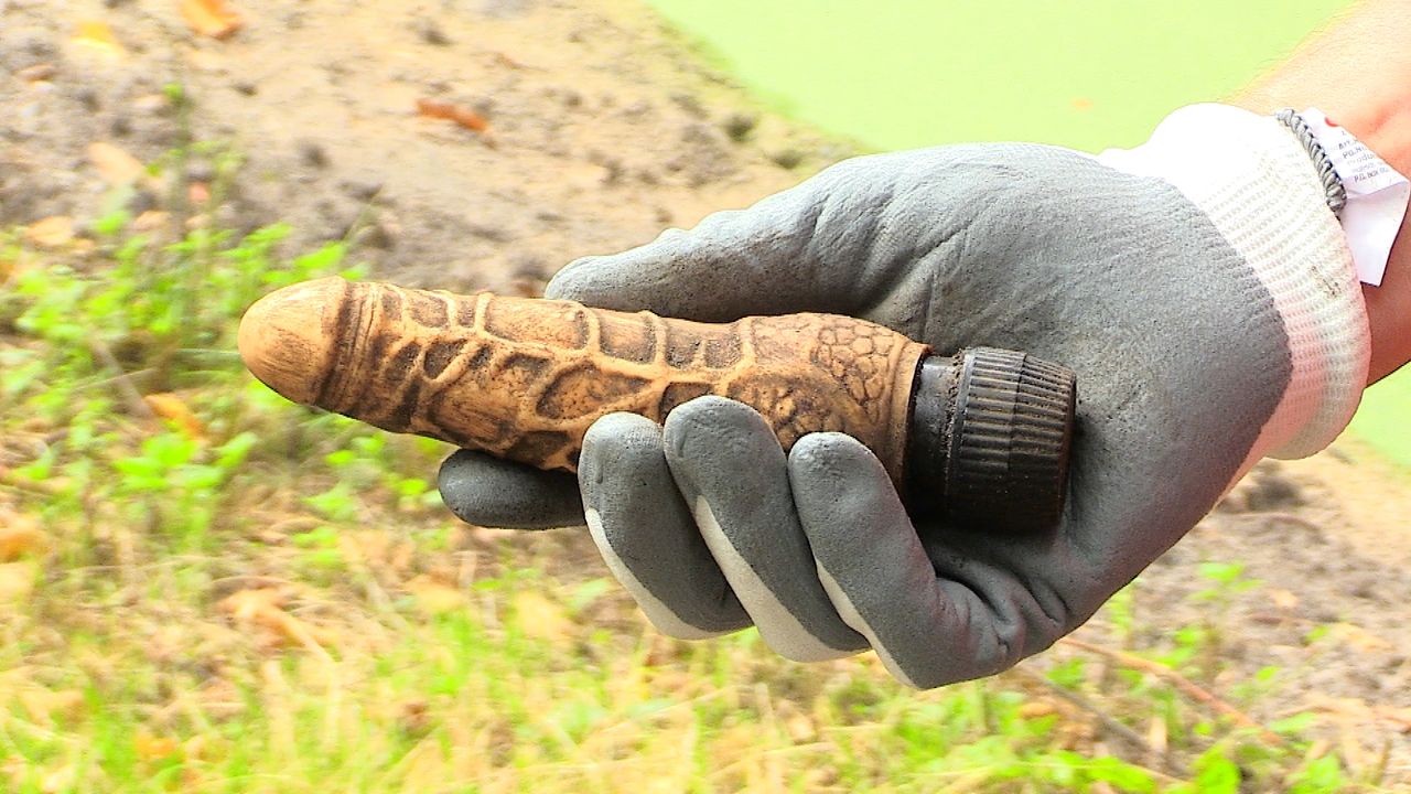 Naast de twee koppen, vele granaten en kogels vinden de bommenruimers ook nog wel iets grappigs. “Dit komt ook uit de vijvers van landgoed", zegt Bernd Burgers terwijl hij een vibrator laat zien. "Zo te zien heeft er iemand hier een hele gezellige tijd gehad en is die het vergeten mee te nemen.”