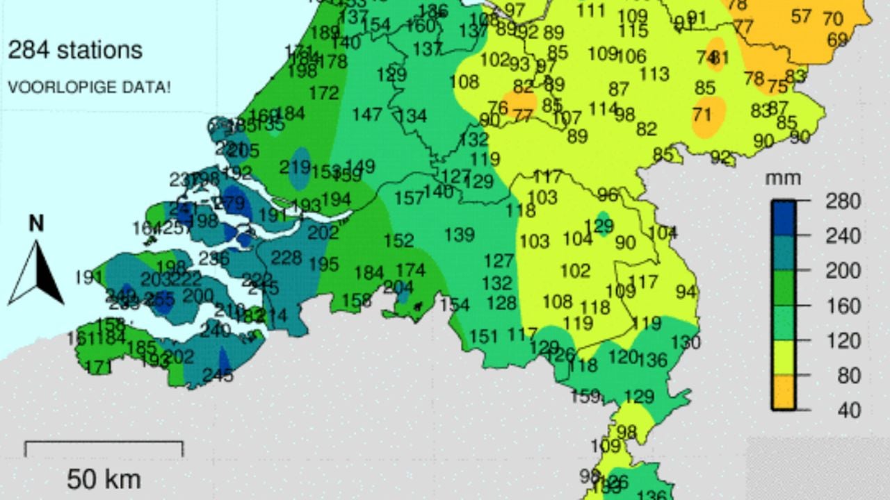 In Klundert viel deze maand 202 millimeter en in Oudenbosch 195 millimeter. Ook in Chaam was het nat met 204 millimeter. Volgens Rico Schröder van Weerplaza komt dit vooral door enorme buien op 10 september. “Toen viel er in het zuidwesten van het land in een dag meer regen dan normaal in een maand.”