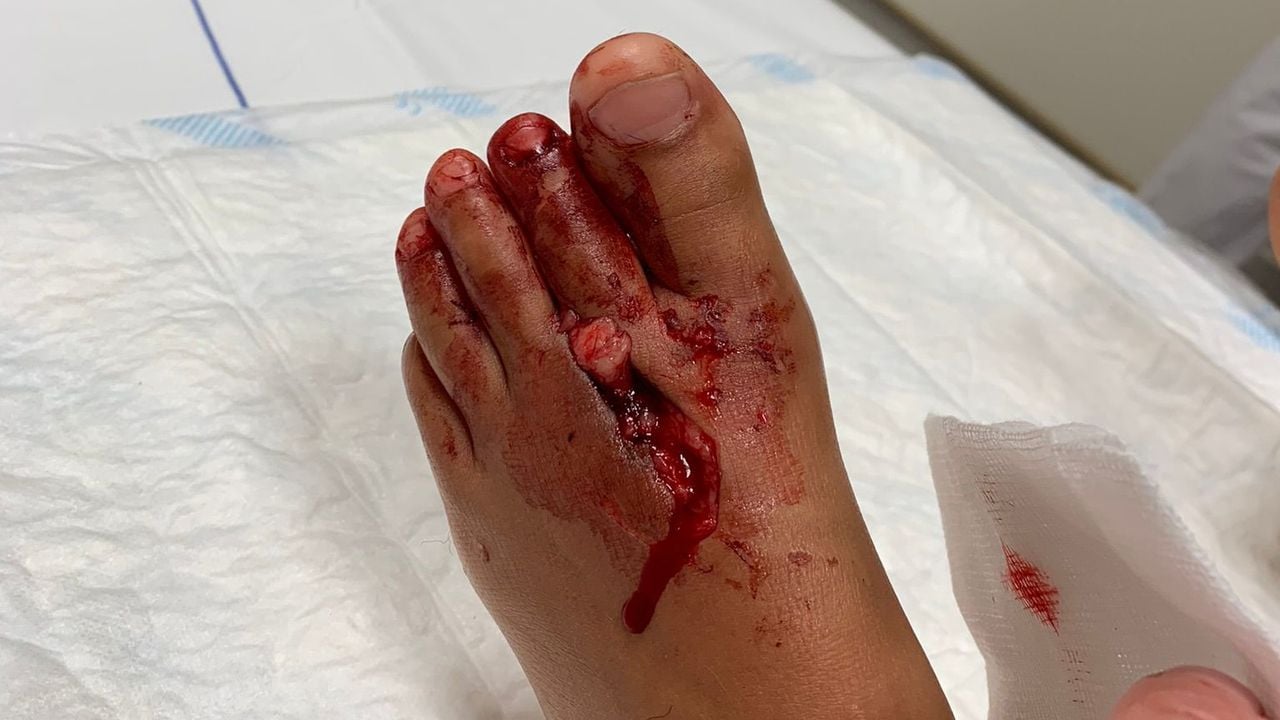 112 werd gebeld en Faro werd in vliegende vaart naar het ziekenhuis gebracht. “Gelukkig bleken er geen pezen of botten kapot, maar het was een enorme wond.”