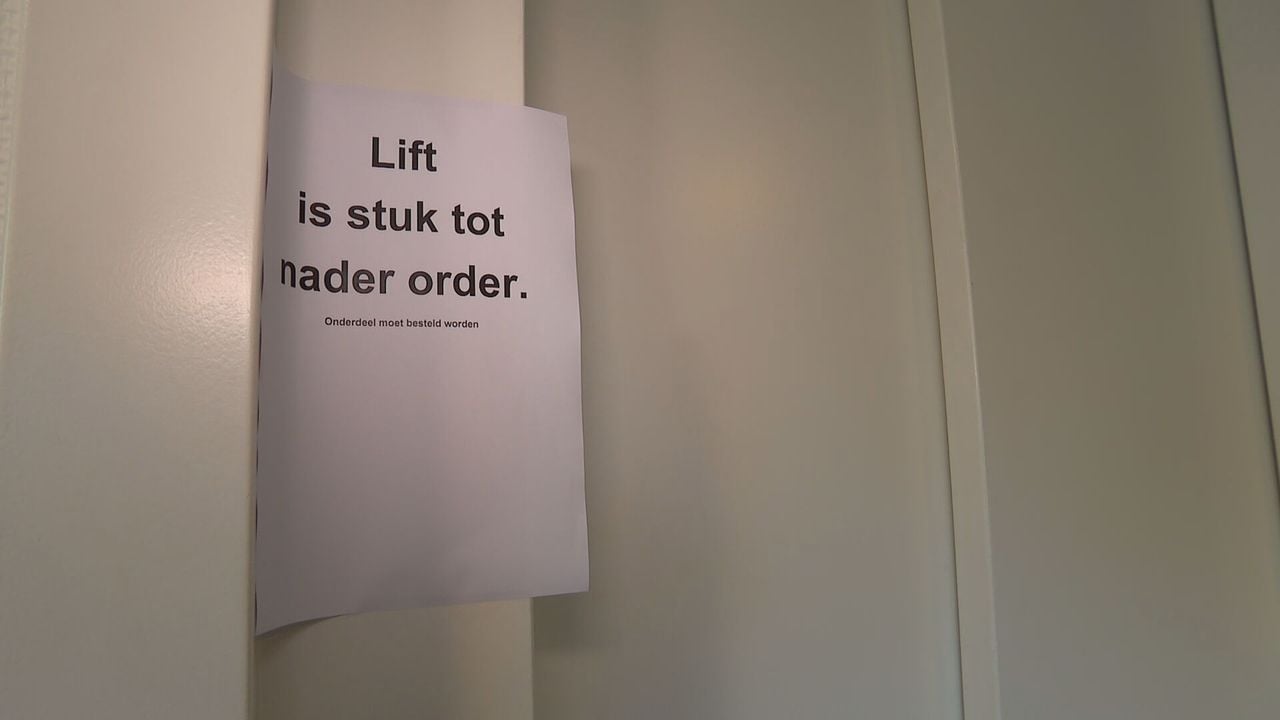 Sinds vorige week zaterdag werkt de lift niet meer. 'Lift is stuk tot nader order, onderdeel moet besteld worden', staat er te lezen op een briefje dat bij de lift hangt.