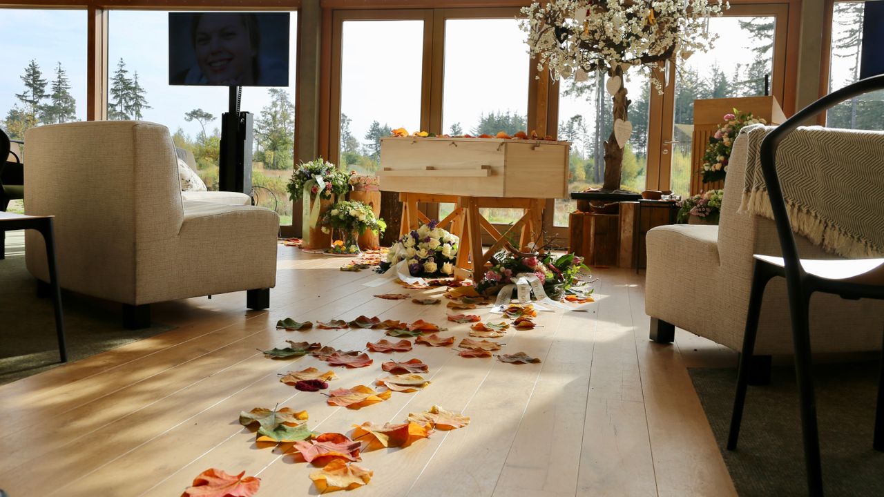 In de ceremonieruimte staat achter de kist een groot portret van Sanne. Op weg naar haar kist liggen gekleurde herfstbladeren op de grond en er staan bloemen.