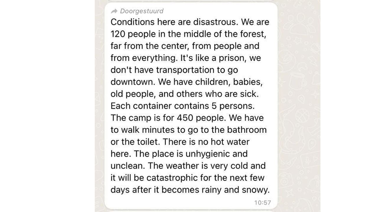 In een bericht dat circuleert op Whatsapp klagen de asielzoekers over de omstandigheden. Volgens de schrijver zitten ze nu met 120 mensen ‘ver van de bewoonde wereld’. Ze vinden het net een gevangenis en hebben geen vervoer naar omliggende dorpen.