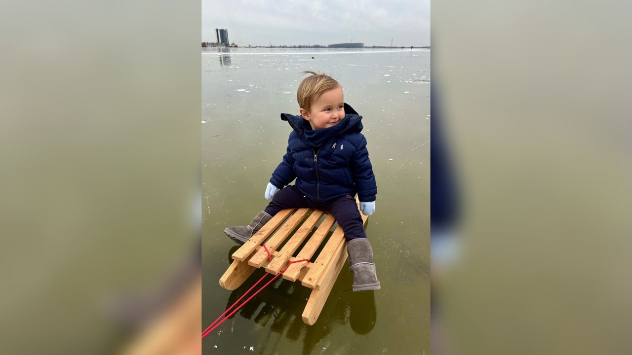 Voor deze kleine lachebek is het zijn eerste keer op het ijs. Daan (1) was heerlijk aan het genieten op de Binnenschelde bij Bergen op Zoom.