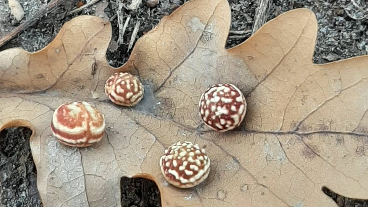 Ineke Doorn zag op de onderkant van een blad van een zomereik een aantal vreemde balletjes. Ze schreef bij de foto die ze stuurde dat ze dacht aan een of andere gal. Dat klopt! Deze balletjes heten fluweelgallen of stuiterbalgallen. In deze ballen ontwikkelen zich insecten met de naam grijze fluweelgalwespen, ook wel aangeduid met de naam eikenstuitergalwesp. Zoals je kunt zien op de foto lijken de gallen inderdaad op een stuiterbal met hun roodgeel gestreepte uiterlijk. Bij oudere gallen zijn de strepen duidelijker zichtbaar. Bij de wat jongere gallen zijn het meer spikkels of gestippelde strepen. De wespen van deze soort worden ongeveer twee millimeter groot.