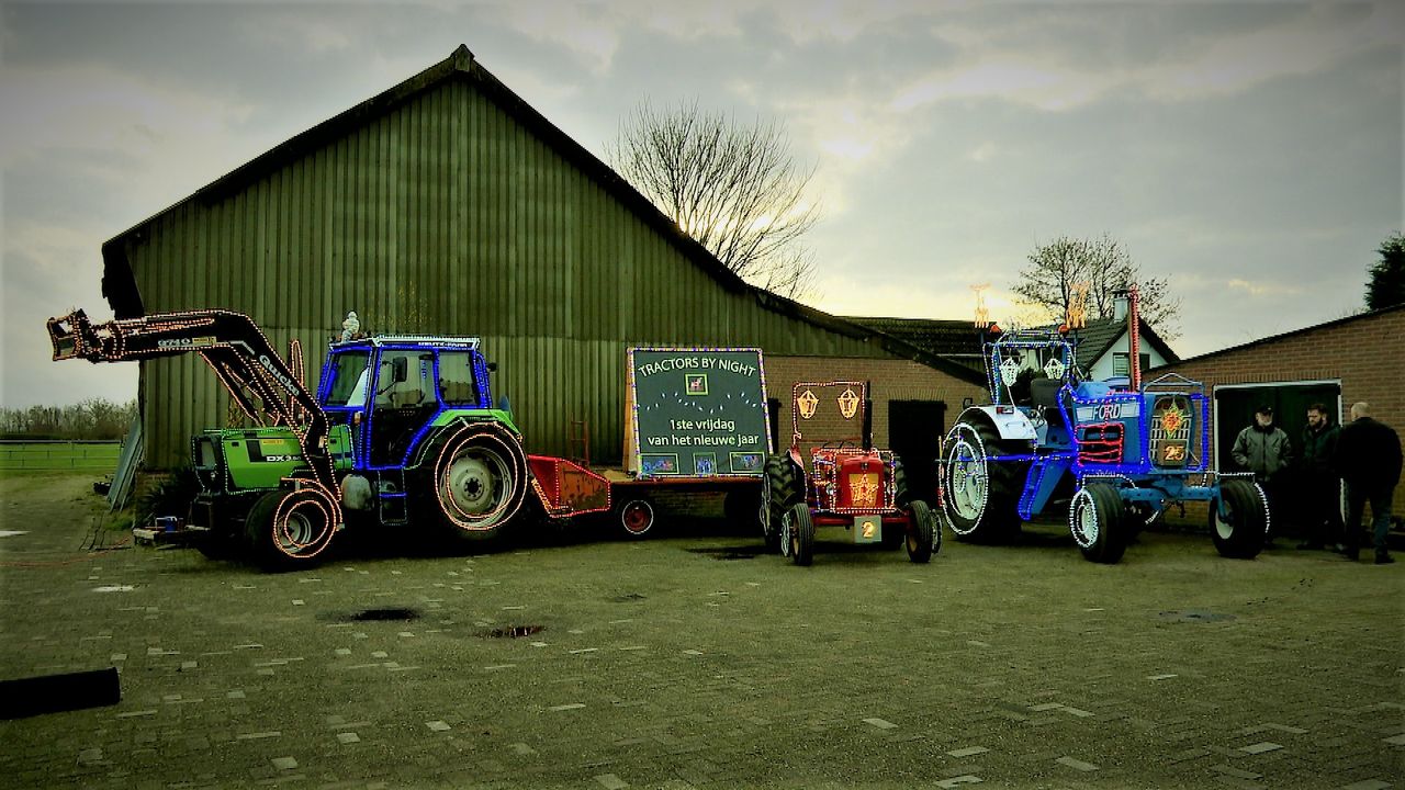 Ook de groene tractor van Jan Buijs is uitgedost met feestverlichting. "Allerlei lichtslangen in verschillende kleuren. Maar ik ben nog niet klaar hoor. Aan de bak komen nog meer lampjes en ik zet er twee hertjes in."