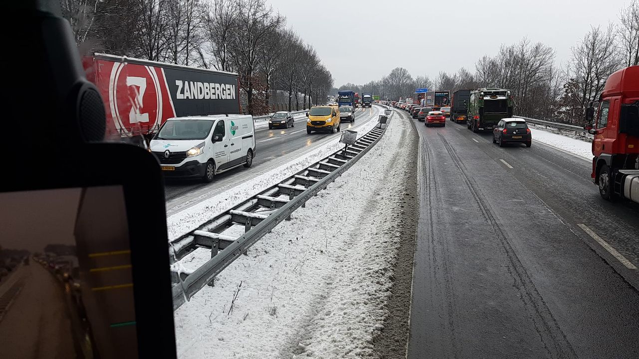 Ondertussen maken de chauffeurs er langs de snelweg in Son het beste van. "Ik denk dat ze allemaal hun best doen om de weg vrij te maken, dus het is niet anders", zegt Ebert. "We pakken een bak koffie en een broodje en dan sluiten we gewoon weer aan. Het zal morgen wel weer over zijn."
