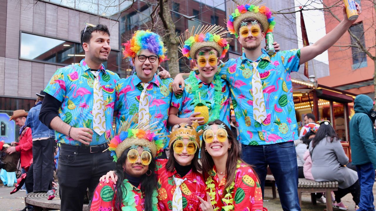 Deze kleurrijke groep uit Delft wil vooral de zon laten schijnen, vertelt Katinka. Ze komt uit Servië en werkt bij de TU Delft. Ook het grootste deel van haar vriendengroep komt uit warmere oorden. "Met deze pakken willen we vooral een beetje warmte uitstralen, want het is hier in Nederland best koud. Het heeft ons niet veel moeite gekost, we hebben deze outfit tijdens onze lunchpauzes bij elkaar geshopt."