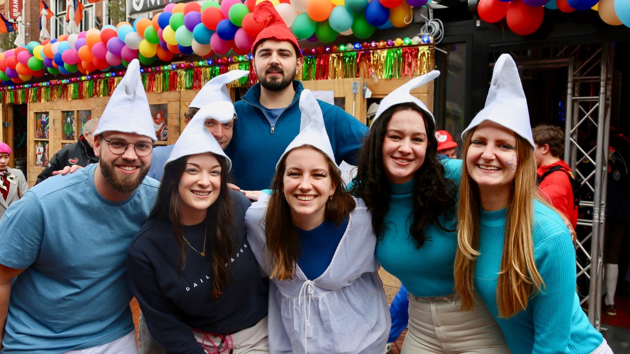 Een groep verkleed als smurfen, het geheel valt op in de meute carnavalsvierders op de Markt. "Dat is ook de reden dat we hiervoor gekozen hebben, we zijn overduidelijk één groep", vertelt Anne. Samen wonen ze in een studentenhuis in Utrecht. "Drie van ons komen uit Brabant: uit Oss, Eindhoven en Breda. De rest leert zo met carnaval integreren in Brabant."
