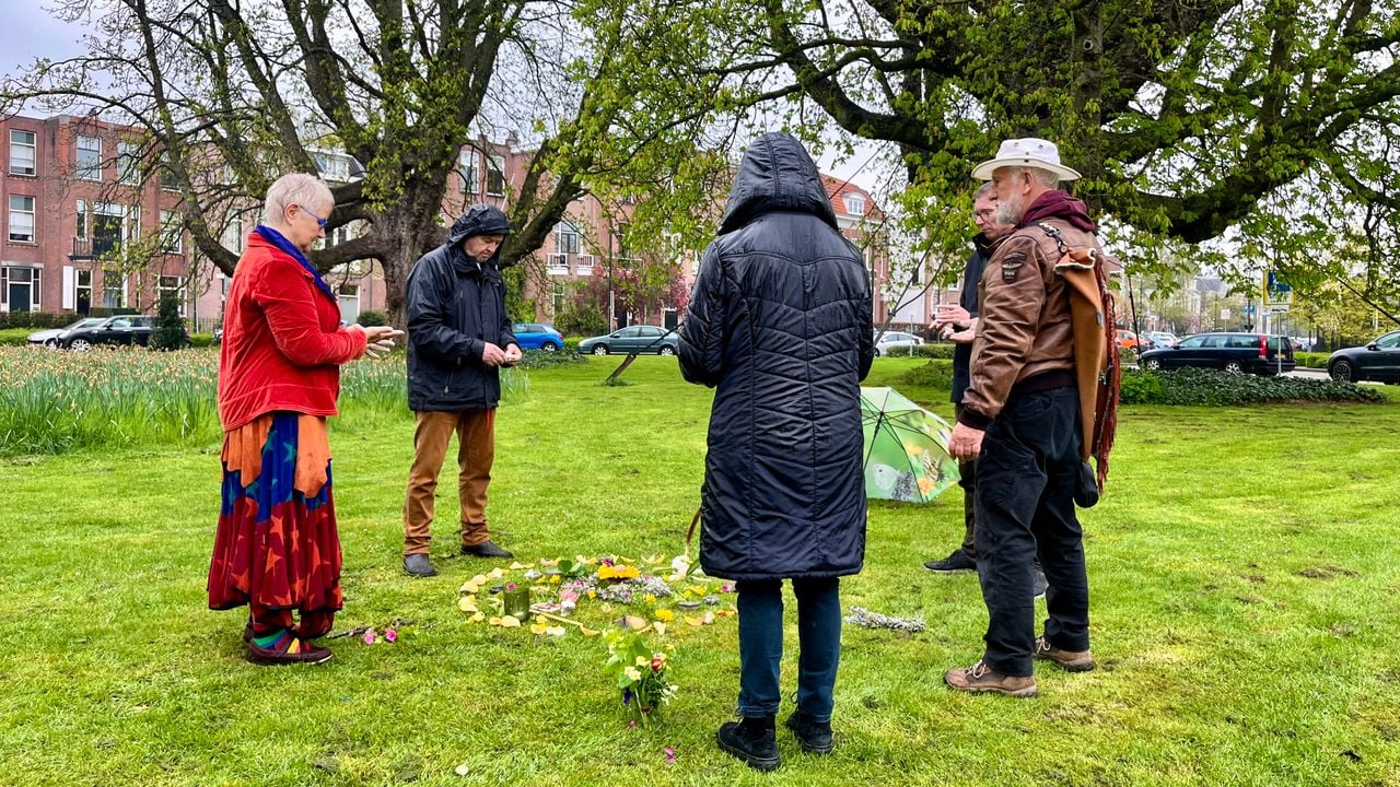 In de regen hield Lisette samen met een paar andere buurtbewoners zaterdagmiddag een afscheidsritueel. Tussen de vier bomen werd een mandala gelegd: een soort krans van takjes en bloemen. "Ik hoop dat we ze hiermee liefdevol energie kunnen geven dat ze goed naar de andere kant kunnen. Terug naar de bron."