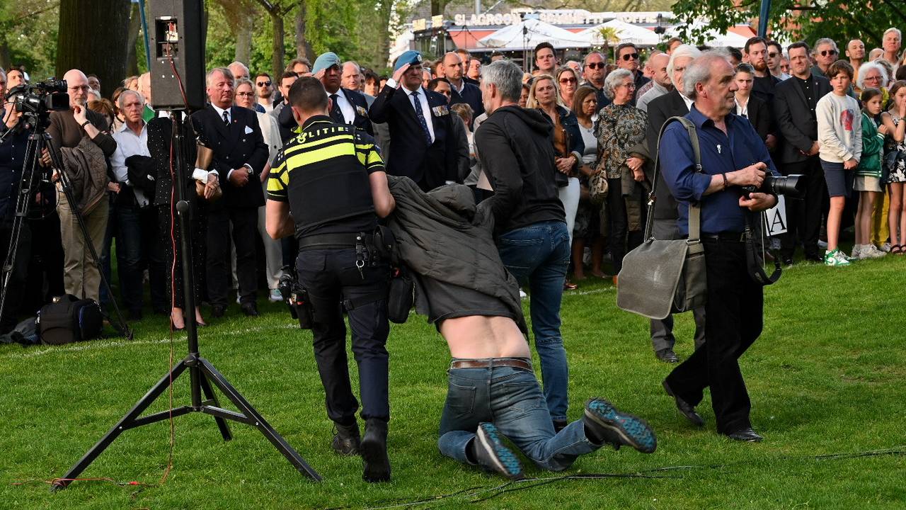 Een agent voerde de man snel af met de hulp van een onbekende man uit het publiek. Triest, noemt de voorzitter het incident. “Maar zoiets is niet te voorkomen. Zo’n herdenking moet open blijven voor iedereen. Dus volgend jaar doen we het weer zo.”