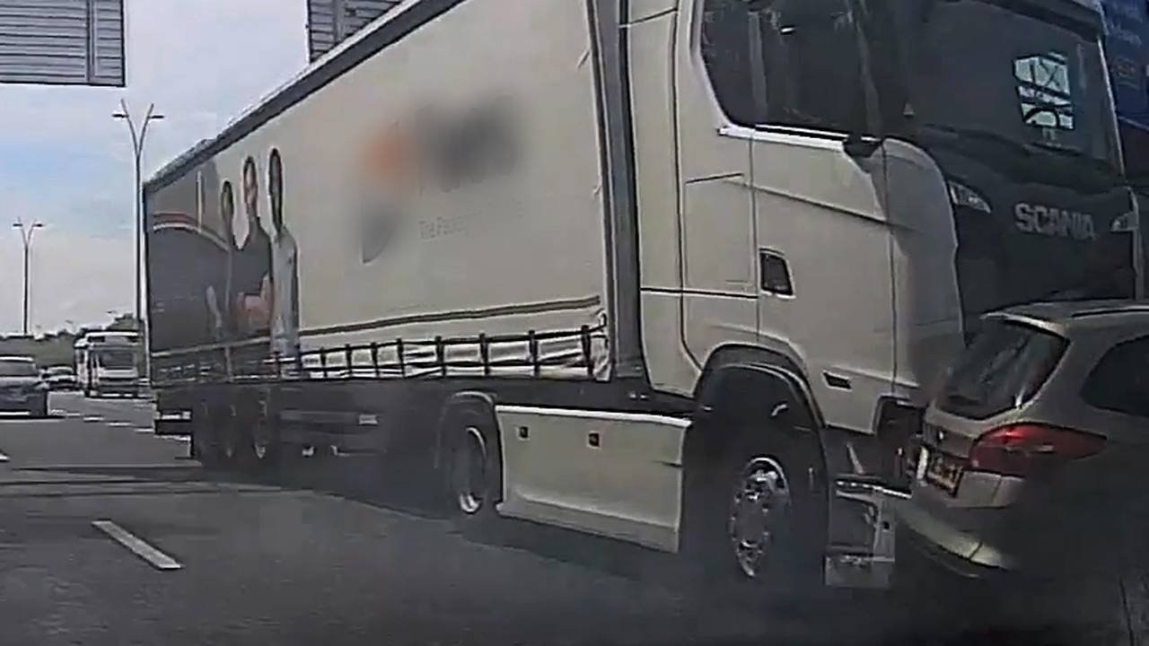 Op beelden op videosite Dumpert is te zien wat er precies gebeurt. De vrachtauto wil op het drukke verkeersknooppunt Ekkersweijer van de A50 een baan naar rechts opschuiven om richting Eindhoven/Helmond te gaan.
