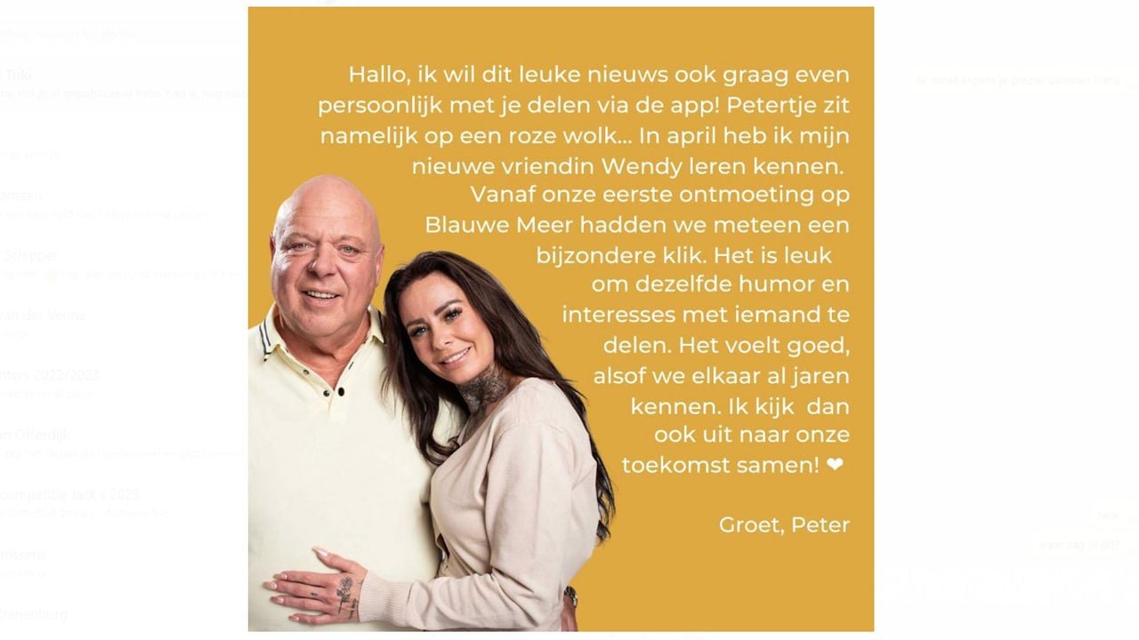 'Peter Gillis maakt bekend dat hij een nieuwe relatie heeft met Wendy van Hout', zo valt te lezen. 'Na het verwerken van zijn vorige relatie met ‘Nicolleke’ staat Peter weer open voor de liefde.'