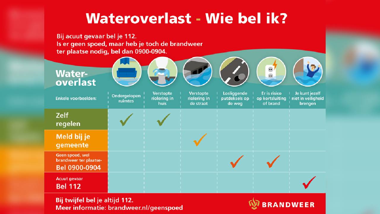 De Veiligheidsregio Midden- en West-Brabant laat weten dat ze de komende uren veel meldingen verwacht bij de meldkamer. Ze roept op om alleen 112 te bellen bij noodgevallen. Ze deelt onderstaande afbeelding waarop je kunt zien wat te doen bij wateroverlast en wie je waarvoor dient te bellen.