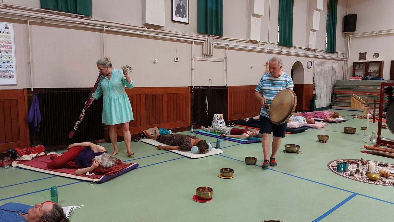In de zaal, waar normaal gesproken tafeltennis wordt gespeeld, liggen deelnemers van het concert op matjes, dekentjes en kussen. “Ik maak klanken met mijn stem en met allerlei instrumenten. Iedereen beleeft het op zijn of haar eigen manier. De een ziet mooie beelden, de ander hoort mooie klanken. Mensen kunnen echt diepe emoties loslaten als ze hier zijn.”